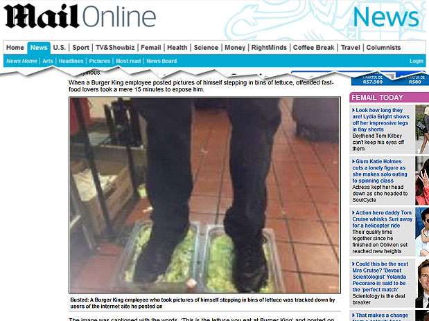 Um funcionário do Burger King dos Estados Unidos postou uma foto no fórum 4chan, na noite de segunda-feira (16), pisando em alfaces, com a seguinte legenda: "este é o alface que vocês comem no Burger King". Segundo informações do site do jornal inglês Daily Mail, demorou apenas 15 minutos para que os próprios usuários do fórum descobrissem o local de onde a foto foi postada.